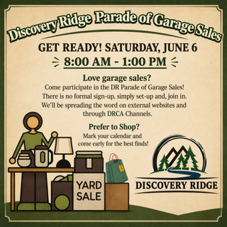 This year’s date for the Parade of Garage Sales is Saturday, June 6. No formal signup is needed. Just set out your items and manage your sale. The DRCA will do the advertising.